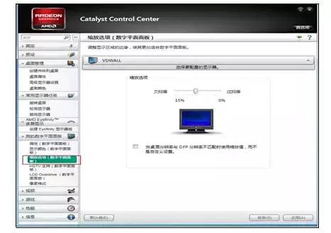 右鍵點擊桌面空白位置,在彈出菜單中選擇“ATI控制面板”,然后在ATI控制面板中選擇“我的數字平面面板”→“縮放選項(數字平面面板)”,將其設置為“過掃描0%”,則DVI信號被設置為滿屏輸出。